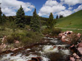 On the eastern side, the trail starts at the western edge of Copper Mountain and is an extension of the trail from Frisco, Dillon, and Breckenridge. It’s roughly five miles long and has a climb of 950 feet to the Vail Pass/Shrine Pass rest stop (a touch below the actual pass, which is on I-70 and not accessed by bicycle). Most of this section is wide open in a valley that separates the interstate. The climb is steady and constant and, for most of the climb is in the 3% to 4% range with an occasional jump to 5% or 6%, particularly near the top where there are a couple of amusing switchbacks. The valley is green, quiet, and filled with creeks, little waterfalls, and wildflowers. If this is your first ride, stop, go slow, and enjoy (just be sure to stop with your bike off the path… it’s rude and dangerous to block the path from other riders). If you are experienced, you can ride this pass as a basic warm-up ride. At the top, you pass under the interstate and can find rest rooms at the Shrine Pass, Vail Pass rest area. The view to the southeast is awesome.